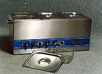 Optional kann das beheizbare Spülbad mit Ultraschall und VE-Wasser betrieben werden. Dazu wird Leitungswasser über eine Vollentsalzerpatrone der Spülkammer zugeführt und diese wahlweise als Stand- oder Fließspüle eingesetzt.